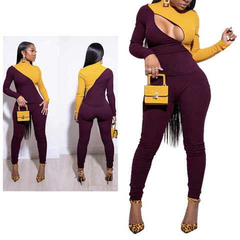 - Women Sexy Two Piece Jumpsuit Outfit, Color Block, Fall Clothes, Zip up, Long Sleeve Pants Set Romper, High Neck