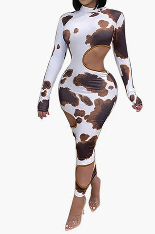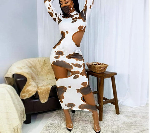 Long sleeve, sexy cutout, elegant long maxi pencil dress, high round neck, hollow out, cow print, pullover, slim fit.