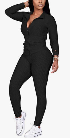 Women jogging suit set, waffle texture design activewear, solid color, long sleeve zipper jackets with thumb hole, two pockets, elastic waist skinny pants, ruched butt lift leggings, slim fit, casual style.