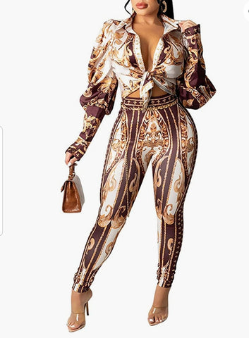 2 piece outfit legging pant set long sleeve button down knot top. High waisted stretch pants.