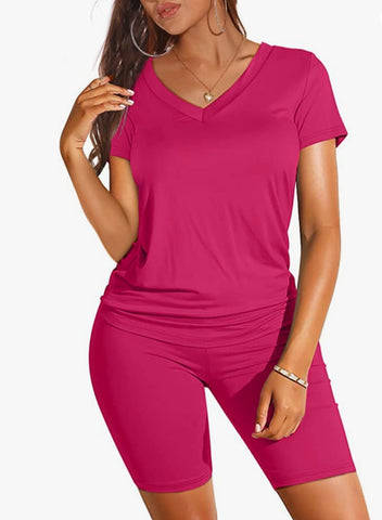 Casual 2 piece lounge outfit is soft, stretchy, and comfy too. Styled with a deep v neck detail.