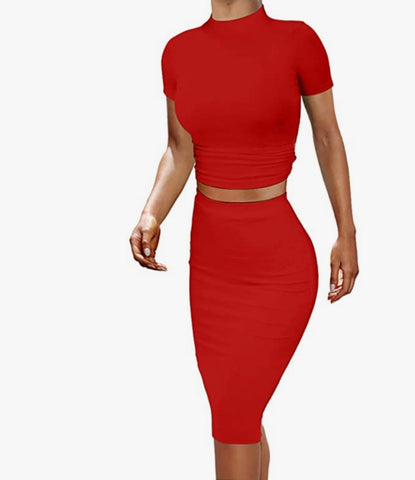 2 piece skirt sets, ruched short sleeve cropped tops, pencil skirts ,midi length, back zipper closure