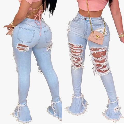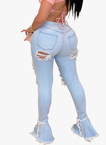 High Waisted Flare Ripped Denim Jeans with button closure. Good Stretch, Long Pants. Looks great with any basic or dressier crop top.