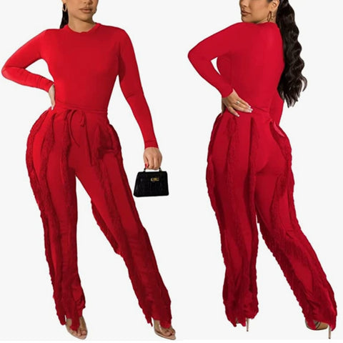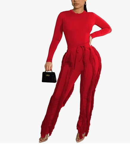 2 Piece Outfit featuring a crew neckline and longsleeve top. The matching pants has stretch, comes in a high-waisted, drawstring waist with fringe tassels.