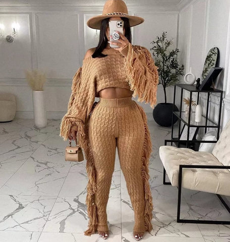Stylish 2 piece fringe set for women outfit. Soft and warm knitted fabric, stretchy, comfortable touch feeling.
