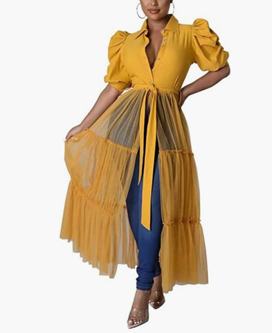 Sexy long shirt dress with Short ruffle puff sleeves, v neck turndown collar and belt. Can be paired with shorts, pants or leggings.