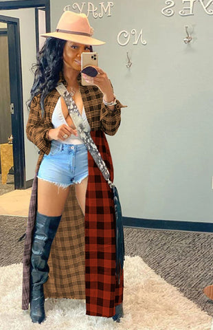 Casual long sleeve button down Duster. Full Maxi length. Can be paired with shorts or leggings and boots to complete the look.