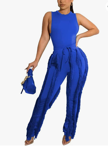 2 Piece Outfit featuring a crew neckline, sleeveless, tank top. The matching pants has stretch, comes in a high-waisted, drawstring waist with fringe tassels.