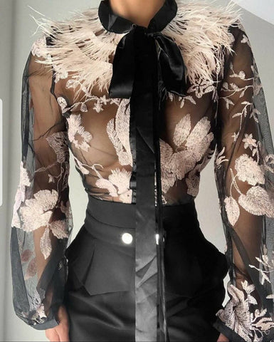 Tie Neck, Long Sleeve, Floral Feather Sheer Mesh Blouse