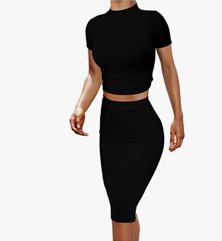 2 piece skirt sets, ruched short sleeve cropped tops, pencil skirts ,midi length, back zipper closure