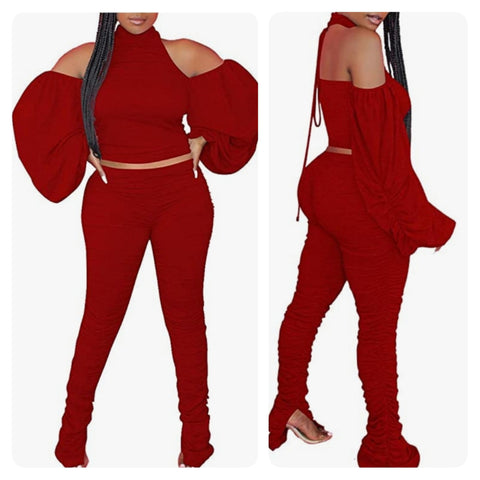 Solid color, lace up halter neck, cut out shoulder, puffed long sleeve crop top, high waist skinny ruched stacked legging pants