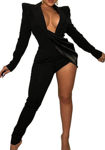 Slay in this Sexy One Piece Jumpsuit. Long sleeve with Shoulder Pads, Deep V-neck, Ruched Waist, Back zipper with Asymmetrical Pants. Soft and Stretchy.